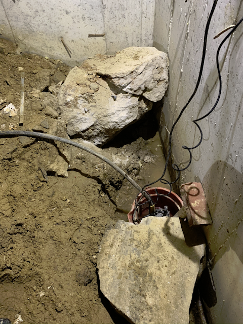 Once on the other side I put in a temporary sump pump set up and realized there was a huge boulder in the corner where the crack is allowing the flooding